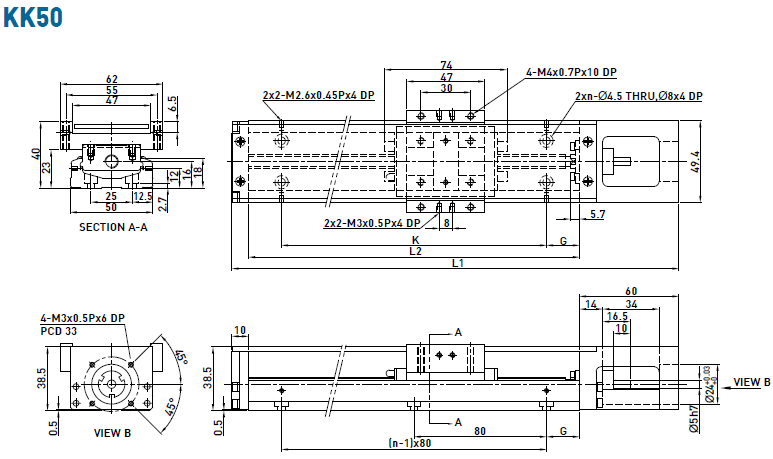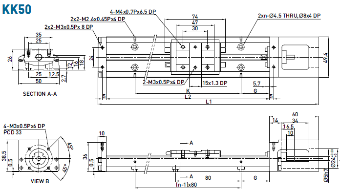 不含護蓋的KK50單軸機器人詳細(xì)尺寸介紹: