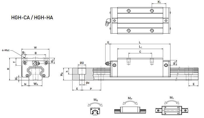 運用四列式圓弧溝槽,配合四列鋼珠等45度的接觸角度,讓鋼珠達到理想的兩點接觸構造,能承受來自上下和左右方向的負荷。